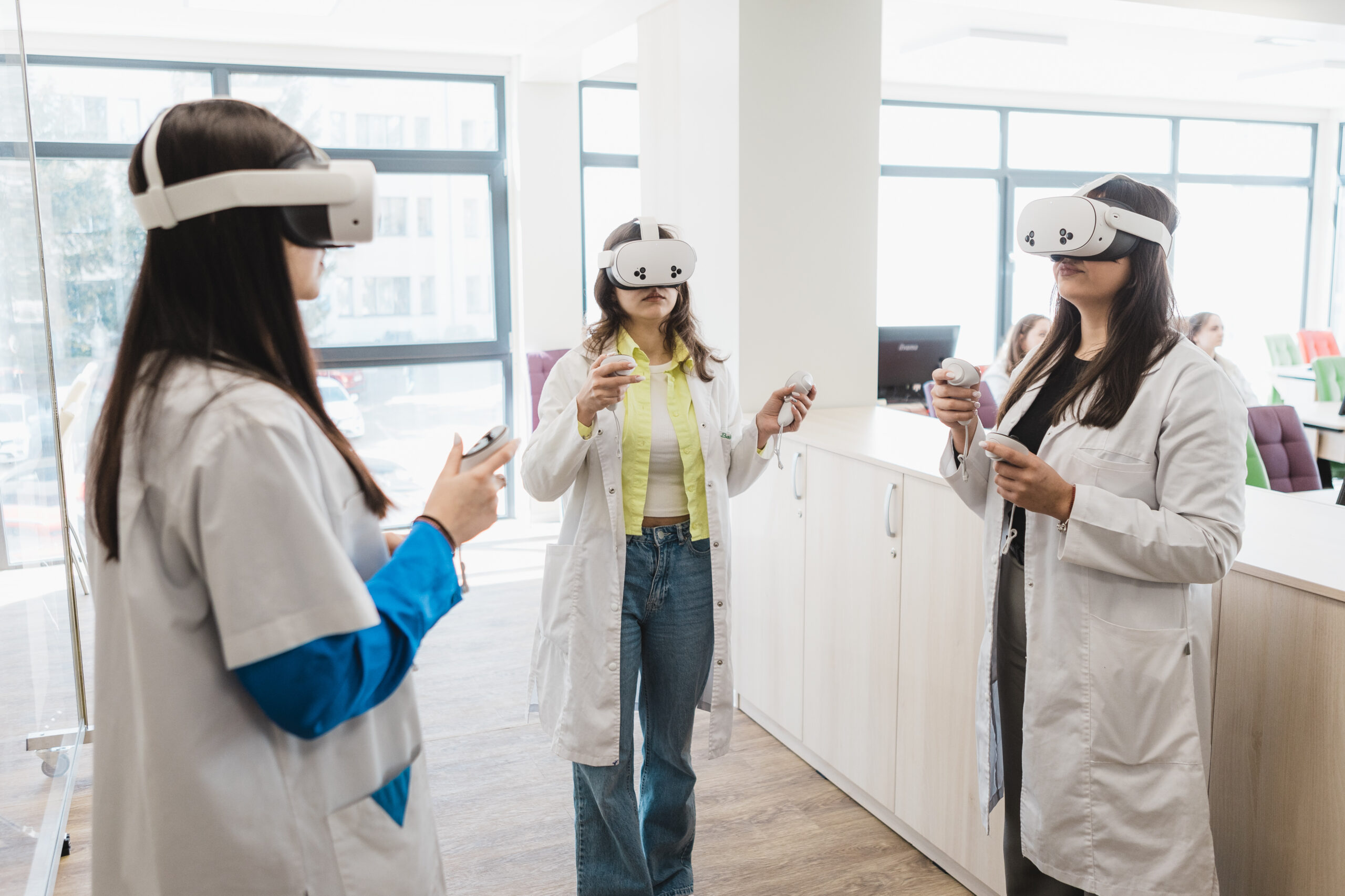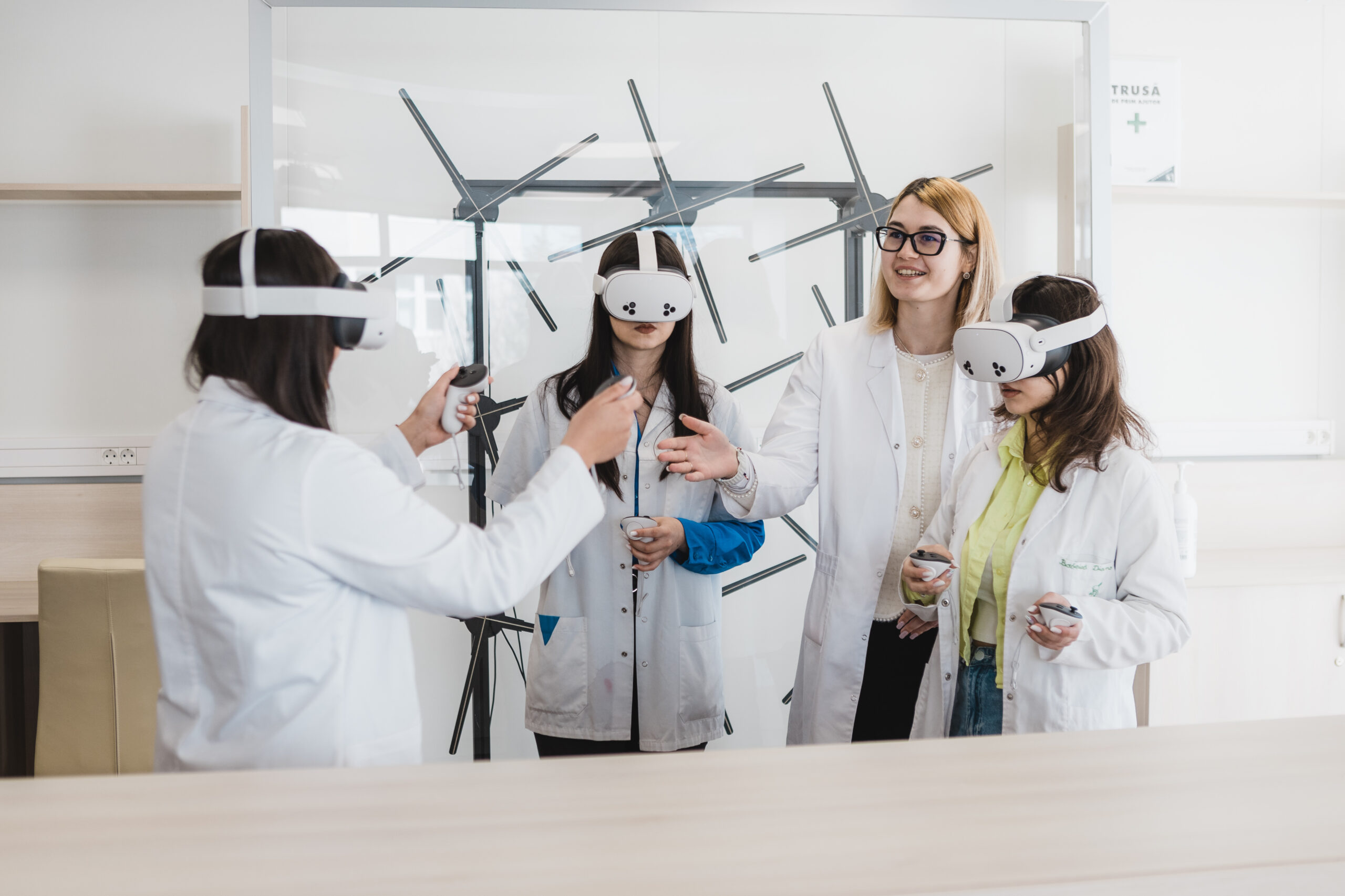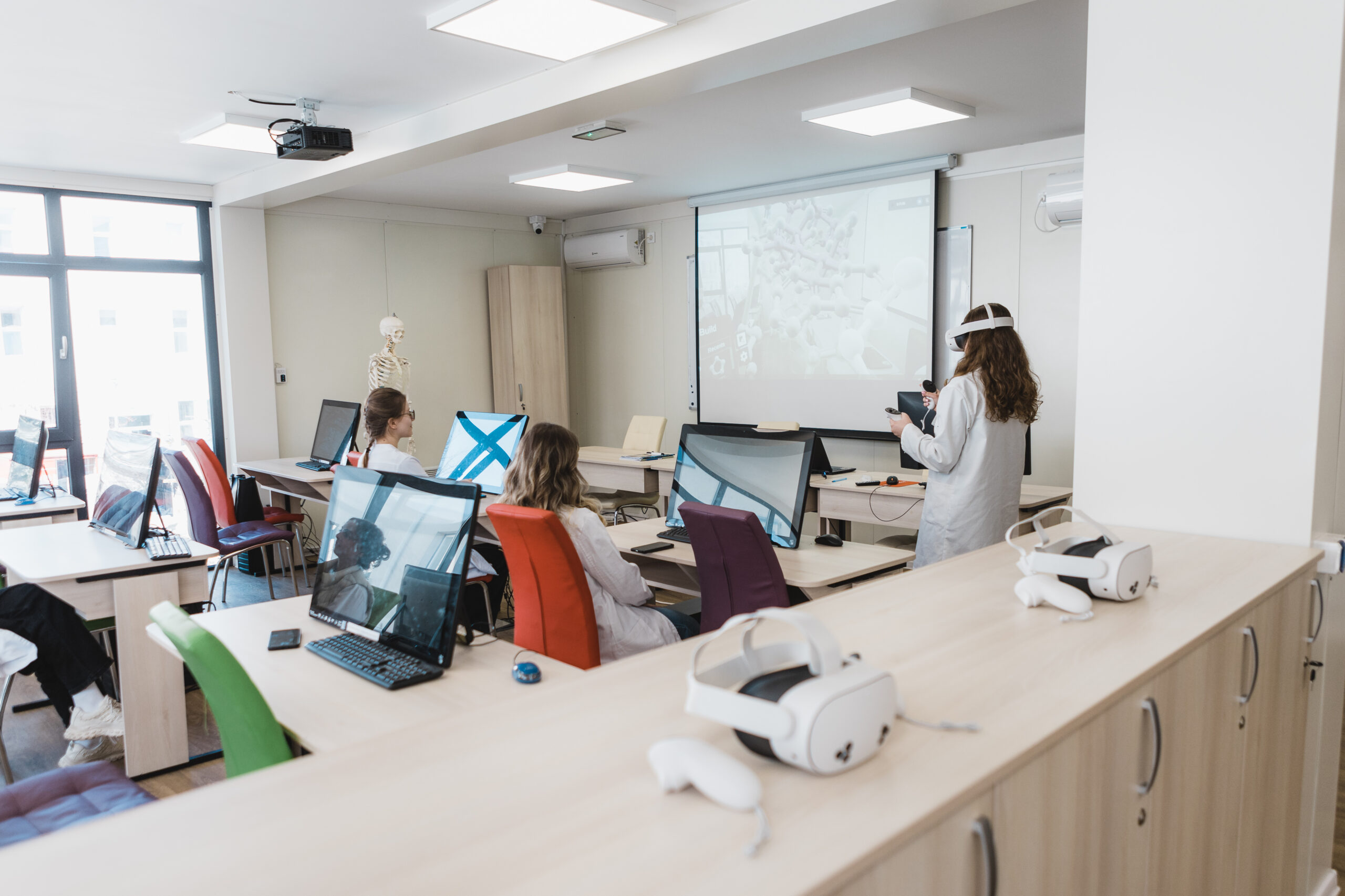 Ochelari de realitate virtuală cu controlere tactile, ideali pentru laboratorul de anatomie virtuală. Dispun de rezoluție înaltă (minim 1800 x 1900 px), rată de refresh de cel puțin 60 Hz și funcționează atât independent, cât și conectați la PC. Echipamentul are stocare internă de minimum 128 GB, memorie RAM de 6 GB, conectivitate Wi-Fi și port USB Type-C. Pachetul include ochelarii VR, 2 controlere tactile, cablu de date, cablu de încărcare și adaptor de alimentare.